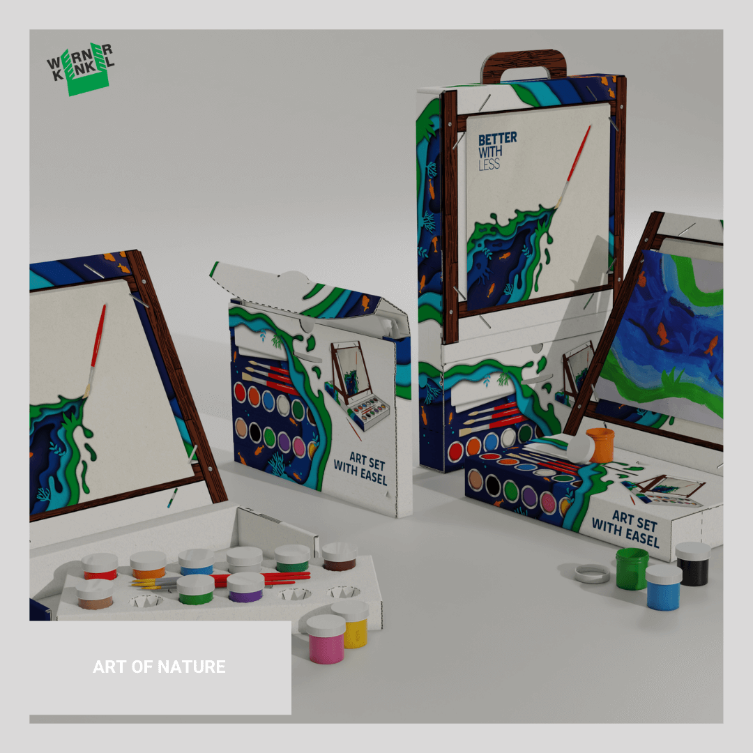 Opakowanie ma kształt poręcznej walizki z zestawem farb, pędzli i bloków malarskich. W kilka sekund, można z opakowania uformować mobilną sztalugę gotową do użycia w dowolnym miejscu. Kartki z bloków malarskich można umieścić na froncie opakowania w pionowym lub poziomym układzie. Z opakowania dzięki systemowi tekturowych zamków można wielokrotnie formować ergonomiczną sztalugę do pracy i walizkę do przechowywania i transportu używanych przyborów artystycznych. Opakowanie w całości jest wykonane z tektury falistej z papieru pochodzącego z recyklingu i jest biodegradowalne. Podczas masowej produkcji, złożenie opakowania do formy walizki obywa się bez użycia kleju. Opakowanie może służyć kupującemu w pracy artystycznej aż do zużycia farb i bloków malarskich. Następnie można z dna opakowania wyciąć teczkę formatu A4 na stworzone prace artystyczne. Na opakowaniu znajduje się szata graficzna ukazująca zawartość opakowania i jego funkcjonalność. Bajkowy motyw grafiki zachęca konsumenta do zakupu i tworzenia własnych prac artystycznych.